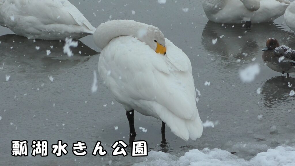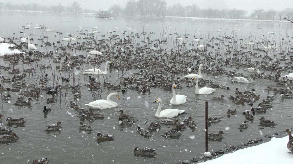 白鳥は、毎年10月上旬に瓢湖を訪れ、3月まで滞在します。