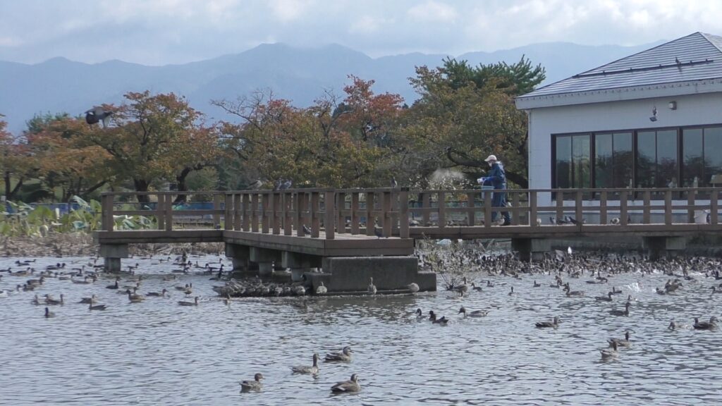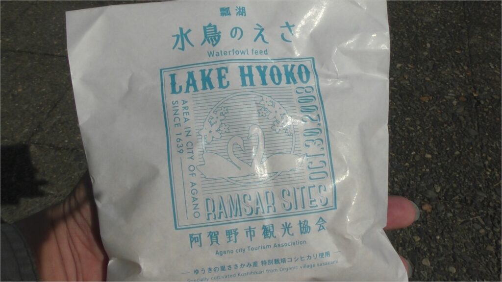 瓢湖の観測舎では白鳥やカモなど水鳥のエサも販売していて、エサやり体験をすることもできます。