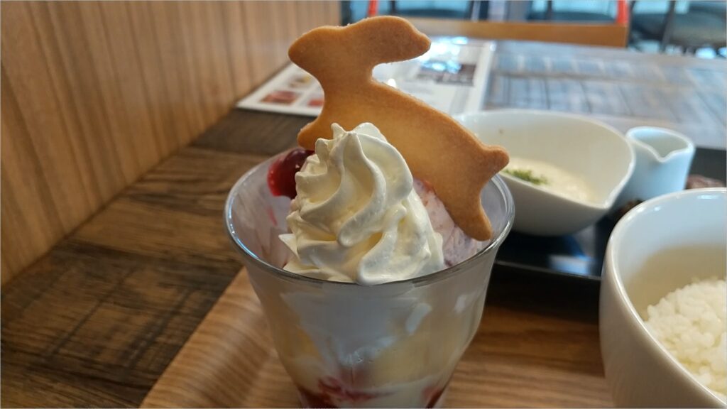 いっしょに注文したストロベリーパフェにはうさぎさんのクッキーもついていて可愛かったです。