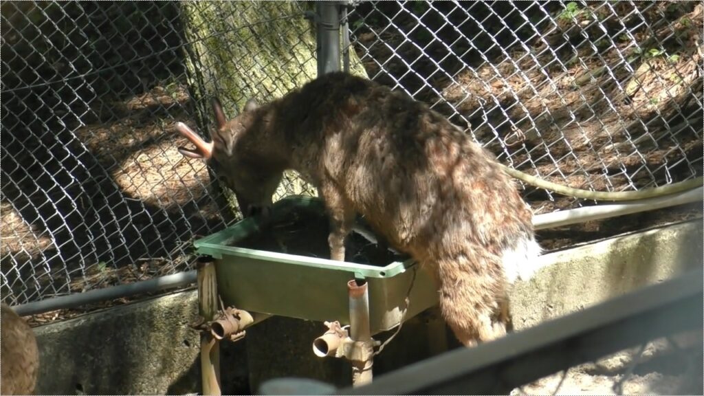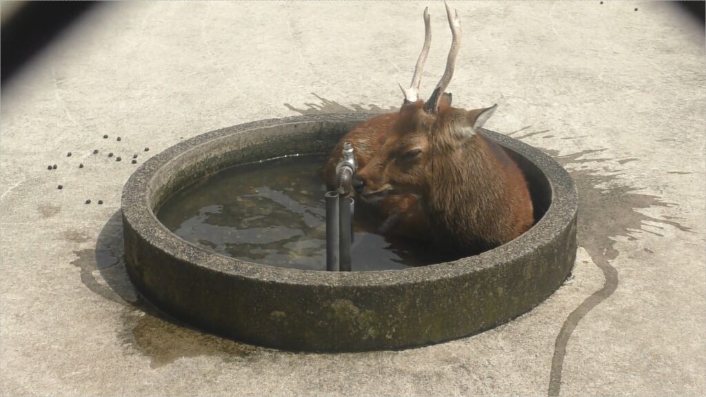シカのいる飼育エリア内では、夏には水飲み場兼水浴び場に溜まった水に、浸りながらくつろいでいる姿を見ることができます。